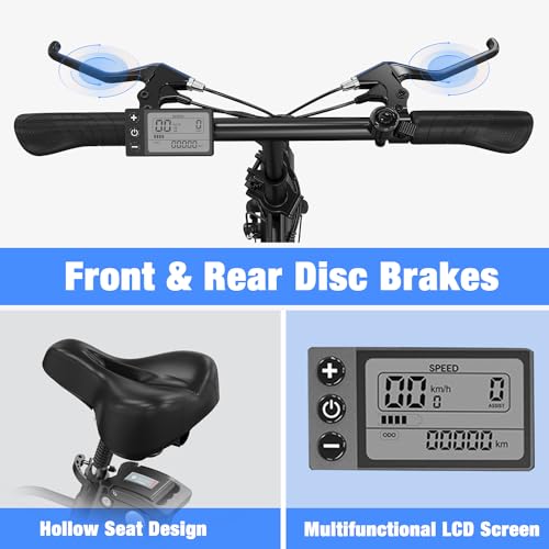 - Sécurité et performances: Le phare et le feu arrière lumineux vous permettent de rouler confortablement la nuit. Les freins à disque avant et arrière assurent la sécurité. Le siège est creux conçu pour éviter l’accumulation d’eau. L’écran LCD fournit toutes les informations nécessaires sur le vélo, y compris la vitesse, le niveau d’assistance, la distance, la puissance de la batterie et plus encore, vous pouvez clairement connaître l’état du vélo