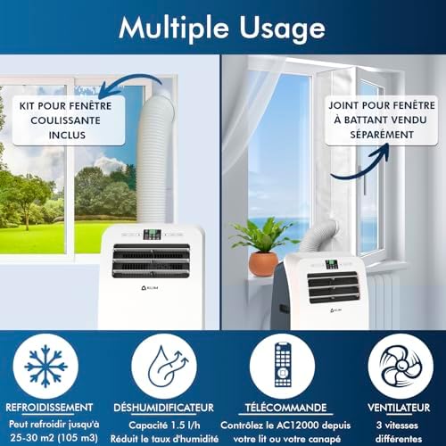 - ✅ FACILE À INSTALLER – Ce climatiseur portable est livré avec un joint de fenêtre spécialement conçu pour les fenêtres coulissantes (horizontalement ou verticalement). Toutes les étapes de montage sont clairement décrites et illustrées dans notre manuel d’utilisation pour rendre l’installation aussi simple que possible. * Si cependant vous disposez de fenêtres à battants, nous vous conseillons d’acquérir dans un premiers temps notre joint de fenêtre KLIM AC disponible sur Amazon.
