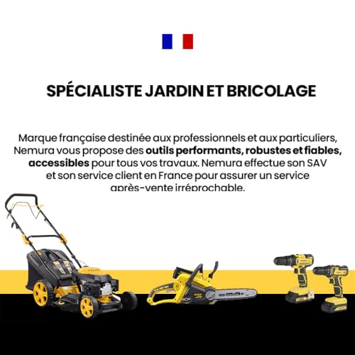 - 🇫🇷【 2 ANS DE GARANTIE ET SAV EN FRANCE 】Nemura est une marque française spécialisée dans les outils de jardinage et de bricolage. Destinés aux professionnels et aux amateurs, les outils Nemura sont innovants et simples à prendre en main. Ils offrent une qualité et une robustesse impeccables ainsi que de hautes performances. Une large gamme d’outillage thermique ou électroportatif, des taille-haies, des tondeuses, des perceuses, des scies…Choisissez l’excellence à la française.