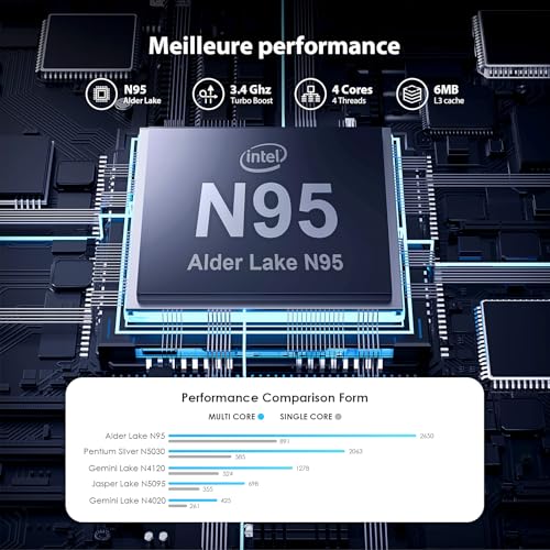 - 【Haute Performance】Cet ordinateur portable est équipé du processeur quad-core In-tel de 12e génération N95, fonctionnant sous le système d’exploitation professionnel Win 11 avec une fréquence turbo maximale de 3,4 GHz, offrant des performances supérieures par rapport aux N5095/N4120/J4105. Son cache haute vitesse de 6M et ses performances fiables peuvent facilement gérer des tâches telles que le traitement de documents, la navigation web et le multitâche léger, garantissant une expérience utilisateur fluide pour le travail, les études et les loisirs.