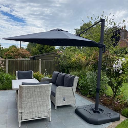 - Le socle croisé pour parasol est inclus, mais la base lestée visible sur la photo n’est PAS incluse. Nous recommandons d’ajouter une base lourde pour une stabilité accrue