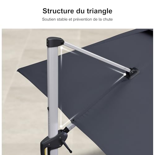 • Ce parasol déporté est doté d’une poignée unique et d’un système de manivelle avec 6 options de hauteur et d’angle et une rotation de 360 degrés pour un contrôle facile de la zone d’ombre